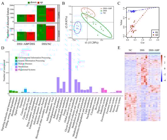 Metabolomics analysis of the effects of Agaricus blazei Murrill polysaccharide (ABP) on metabolites. (A) Differentially abundant metabolites between groups in positive and negative ionization modes; (B) results of PLS−DA analysis; (C) replacement test results; (D) categorization of differentially abundant metabolites; (E) overall metabolite abundance profiles and clustering of groups, (n = 8).