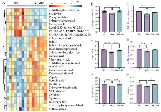 In order to assess the effect of ABP intervention on gut metabolism, we performed an untargeted metabolomic analysis of cecum contents based on LC-MS technology. The results showed that the abundance of several metabolites, including 4-hydroxyquinoline, was up-regulated or decreased in DSS-induced UC mice after ABP treatment. The expression levels of 3-hydroxybenzaldehyde, 3-hydroxybutyric acid, caffeic acid, and zapotin have been reported to be closely associated with the inflammatory response and oxidative stress and have therapeutic potential for UC [,,,]. Subsequently, we examined the abundance of six metabolites (3-hydroxybenzaldehyde, 3-hydroxybutyric acid, caffeic acid, hexafluoroisopropanol, sulfanilamide, and zapotin) identified in the sequencing analysis. As expected, the abundance of these metabolites significantly decreased in DSS-induced UC and significantly increased after ABP treatment.