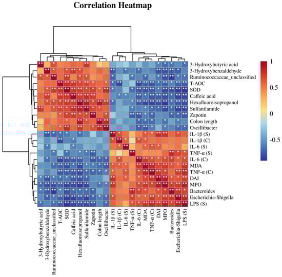 Spearman correlation analysis. A heatmap construction for the correlation analysis of gut microbiota, metabolites, and physiological and biochemical indicators. White star indicates significance analysis, * p < 0.05 and ** p < 0.01.