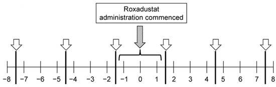 Roxadustat (Astellas Pharma Inc., Tokyo, Japan; 20-, 50-, and 100-mg tablets) was the HIF-PHI used. After switching from an erythropoiesis-stimulating agent (ESA) to roxadustat for the treatment of renal anemia, the doses of iron and roxadustat administered were adjusted in accordance with the recommendations of the Asia Pacific Society of Nephrology (APSN) regarding the appropriate use of HIF-PHIs [1] and the Guidelines for Renal Anemia in Chronic Kidney Disease [21]. Because thromboembolism has been reported to be a complication of HIF-PHI administration that is associated with iron deficiency [22,23], iron was supplemented when the serum ferritin concentration of a participant was <100 µg/L or their transferrin saturation was <20% during roxadustat administration.