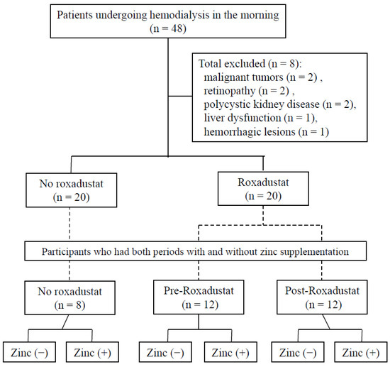 A retrospective study was performed in outpatients who were undergoing maintenance hemodialysis in the morning. Those undergoing hemodialysis in the afternoon were excluded because the circadian rhythm of serum zinc concentration involves a peak in the morning and a decrease of approximately 20% in the afternoon [18]. Patients who avoided the use of HIF-PHIs or used them with caution for the treatment of renal anemia (those with malignant tumors, retinopathy, liver dysfunction, or polycystic kidney disease) were excluded, as were patients with hemorrhagic lesions. All the participants received standard dietary advice for patients undergoing hemodialysis, but no further advice was provided regarding their diet before the commencement of hemodialysis.
