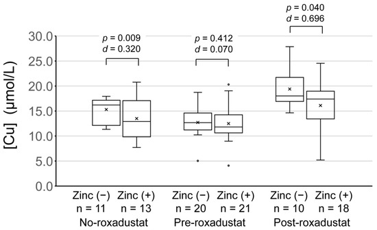 [Cu] in the period of zinc supplementation and the period of no supplementation in participants who did not administer roxadustat and pre- and post-roxadustat in those who did. The baseline characteristics of the two groups were compared using the two-sample Student’s t test, assuming unequal variances. Effect size was compared using Cohen’s d. [Cu], serum copper concentration; pre-roxadustat, data obtained during the 8 months prior to roxadustat administration; post-roxadustat, data obtained during the 8 months after roxadustat administration commenced; no roxadustat, data obtained during the same 8 months as the post-roxadustat period in participants who did not administer roxadustat; zinc (+), data obtained during the period of zinc supplementation; zinc (−), data obtained during the period of no zinc supplementation.