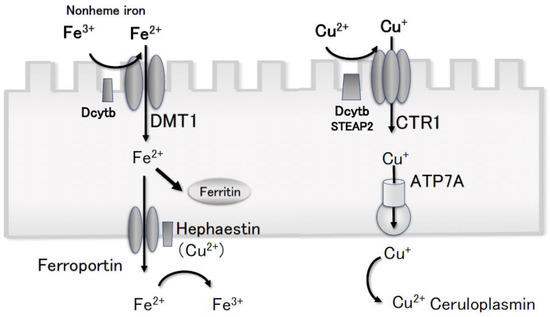 The explanation for the increase in serum copper concentration in HIF-PHI users is an HIF-2α-induced increase in the expression of divalent metal transporter 1 (DMT1) and duodenal cytochrome b [28], which are involved in the absorption of divalent cations such as iron, copper, and zinc. HIF-2α increases the expression of ferroportin [29]. In addition, HIF-2α increases the expression of the copper transporters CTR1 [30,31] and ATPase 7A [32], which are involved in the absorption of monovalent copper in the duodenum (Figure 5).