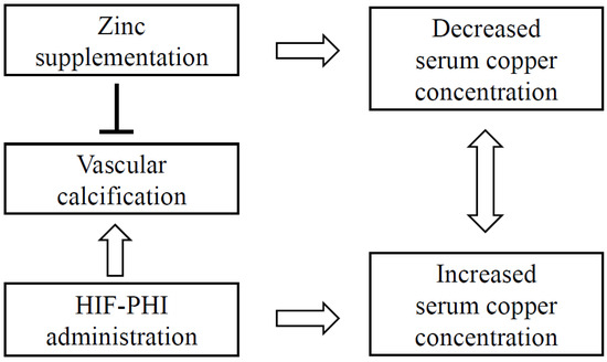 Zinc contributes to bone mineralization by inhibiting bone resorption and promoting bone formation [48], but it also inhibits vascular calcification. HIF-PHIs exacerbate vascular calcification because HIF-1α promotes phosphate-induced vascular smooth muscle cell calcification [49]. Zinc also inhibits the calcification of vascular smooth muscle cells that is induced by HIF-1α [8]. Zinc acts via G-protein-coupled receptor 39 to induce the expression of tumor necrosis factor-alpha-induced protein 3 and inhibits nuclear factor κB, thereby reducing phosphate-induced vascular calcification [50]. Therefore, zinc would be expected to prevent calcification when administered to patients whose renal anemia is being treated using an HIF-PHI. In the present study, it was shown that the increase in serum copper concentration caused by the administration of an HIF-PHI can be used to balance the serum zinc and copper concentrations of patients during zinc supplementation. In other words, it was shown that the increase in serum copper concentration owing to HIF-PHI administration is offset by the decrease in copper concentration caused by zinc supplementation (Figure 6). In addition, the use of zinc supplementation alongside the administration of an HIF-PHI prevented the reduction in serum copper concentration caused by zinc supplementation and was found to be safe.