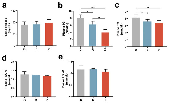 Figure 1a illustrates the impact of oral CO on the rats’ blood sugar levels. The results indicate that there was no significant difference in blood sugar levels among groups G, R, and Z. Both the R and Z groups showed a significant decrease in plasma TG and TC levels compared to the G group (Figure 1b,c). Moreover, the plasma TG in the Z group decreased significantly as compared to the R group, while the plasma TC showed a slight but not significant decrease. Notably, there were no significant changes observed in the HDL-C and LDL-C levels across all groups (Figure 1d,e). Overall, this study emphasizes the positive effects of CO on the regulation of blood lipids, with virgin CO yielding better results than refined CO.