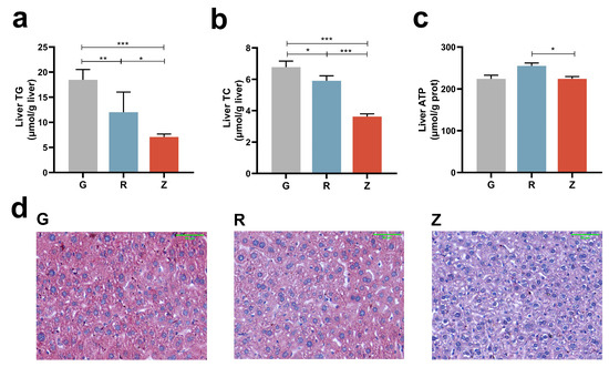 Figure 2 depicts the levels of TG and TC in the livers of the rats. Remarkably, both the R and Z groups exhibited a significant decrease in TG and TC content when compared to group G (Figure 2a,b). Furthermore, the liver TC and TG contents in group R was notably higher than those of group Z. In terms of the liver ATP contents, group Z did not display any significant difference when compared to group G, whereas group R exhibited a significant increase when compared to group Z (Figure 2c). The Oil Red O staining indicated that the lipid contents in the livers of groups R and Z were considerably lower than those group G, with group Z having lower lipid contents than group R (Figure 2d). These results suggest that CO, particularly virgin CO, plays a pivotal role in regulating lipid accumulation in the liver.