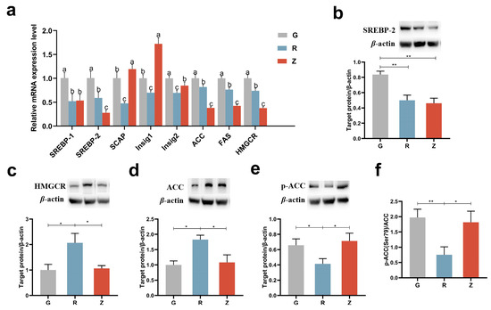 Western blot (WB) analysis indicated that the protein content of SREBP-2 was significantly reduced in group R as compared to group G (Figure 4b). Consistent with the mRNA levels, the protein contents of SREBP-2 was lower in group Z than in group G. However, group R exhibited higher protein contents of ACC and HMGCR as compared to group G (Figure 4c,d). Similarly, the protein contents of ACC and HMGCR were lower in group Z than in group R. Moreover, the protein content of phosphorylated ACC in group R was lower than in groups G and Z (Figure 4e). When calculated, the phosphorylation level of ACC indicated a much lower level of phosphorylation in group R as compared with groups G and Z (Figure 4f). Overall, the virgin CO administration downregulated the genes responsible for lipid synthesis.