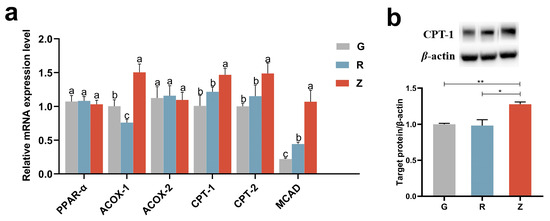 The effect of refining on the key enzymes involved in fatty acid oxidation is shown in Figure 5. Compared with group G, the expression of acyl-CoA oxidase-1 (ACOX1), the rate-limiting enzyme of peroxisomal fatty acid β-oxidation (FAO), significantly decreased in group R [36]. Conversely, the expressions of ACOX1, medium-chain acyl-CoA dehydrogenase (MCAD), carnitine palmitoyltransferase-1 (CPT-1), and carnitine palmitoyltransferase-1 (CPT-2) significantly increased in group Z. Moreover, the expression levels of ACOX1, CPT-1, and CPT-2 in group R were significantly lower than those in group Z. There were no significant differences in the expression levels of acyl-CoA oxidase-1 (ACOX2) and the peroxisome proliferator activator receptor α isoform (PPARα) among different groups. WB analysis revealed a significant increase in the protein contents of CPT-1 in group Z as compared to groups G and R (Figure 4b).