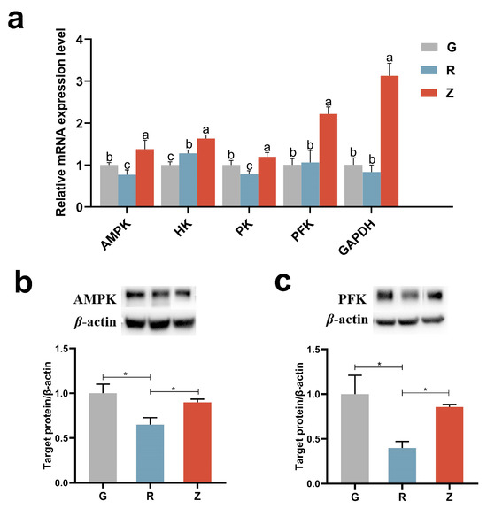 As shown in Figure 6, compared with group G, the AMP-activated protein kinase (AMPK) expression level in group R was significantly reduced. The effect of refining on key enzymes in glucolysis is also shown in Figure 6a. Compared with group G, the expression of hexokinase (HK) in group R significantly increased, while the expression of pyruvate kinase (PK) significantly decreased, and the expression of phosphofructokinase (PFK) and glyceraldehyde phosphate dehydrogenase (GAPDH) did not change. The expression levels of HK, PK, PFK, and GAPDH in group Z were significantly higher than those in group G and R.
