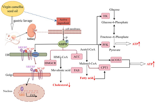In conclusion, the AMPK activation induced by virgin CO administration can switch on catabolic pathways, such as fatty acid oxidation and glycolysis, to generate ATP and can switch off anabolic pathways, such as fatty acid synthesis. Therefore, virgin COalleviates dyslipidemia and lipid deposition in the kidneys. Chronic administration of small molecule activators elevates the expression and phosphorylation of AMPK in the kidneys and slows down the progression of chronic kidney disease [61,73]. The literature reports have indicated that CO contains direct or indirect activators of liver AMPK [26]. Hydroxytyrosol, a major phenolic substance in virgin olive oil was reported to activate AMPK [74]. It is noted that the polyphenols contained in virgin CO, like benzoic acid and gallic acid, could also activate AMPK, while their contents in refined oil decrease sharply, which partly explains the different regular effects of refined and virgin CO [5,75,76]. Our research demonstrated the presence of activators for kidney AMPK in virgin CO. The proposed mechanism by which the virgin CO regulated the glycolipid metabolism through the AMPK-SREBP pathway in the kidneys of rats fed with a high-fat diet is shown in Figure 7. However, other substances in edible oils can also directly or indirectly activate the AMPK signaling pathway [77,78,79]; thus, the specific substances responsible for AMPK activation in virgin CO have not been identified.