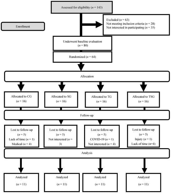Throughout the study duration, 20 participants withdrew from the study due to medical conditions, work-related challenges, and a lack of sustained interest in the research. As a result, each group had 11 participants remaining for the subsequent analysis. Detailed instructions regarding the execution of training protocols were given to each group during the third session, coinciding with measurements of body mass and VO2peak.