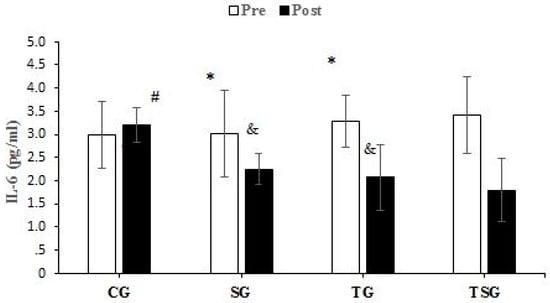 Pre- and post-training values (mean ± SD) for IL-6 in control (CG), Supplement (SG), training (TG), and Training + Supplement (TSG) groups. & Significant differences with pretest values (p < 0.05). * Significant differences with the control group (p < 0.05). # Significant interaction between time and groups (p < 0.05).