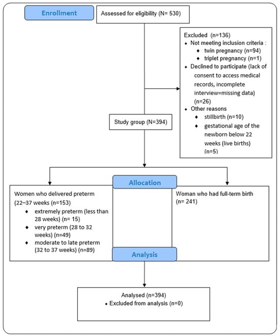 The present study was a multi-center, retrospective, cross-sectional study among a group of 394 Polish women (in the Polish population, ethnic minorities represent a relatively small percentage of the total population, so we did not distinguish ethnic groups) in the postpartum period and after singleton pregnancy; of which, 153 women delivered preterm (22–37 weeks) (38.8%) and 241 had a full-term birth (38–42 weeks) (61.2%). We used a questionnaire with the structure of the medical interview. Also, medical history, especially maternal and neonatal outcomes, were analyzed (see the Supplementary Materials). We followed the STROBE guidelines for cross-sectional studies []. All procedures were performed in accordance with the principles outlined in the Declaration of Helsinki of the World Medical Association (WMA) and approved by the Bioethics Commission of the Gdansk Medical University, no. NKBB/393/2015 for studies involving humans.