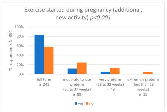 We also asked women about self-perceived maternal exercise during pregnancy (new exercise, started after becoming pregnant) and we compared the results with that of the gestational age at delivery (weeks) category. Pearson’s chi-squared test showed statistically significant differences between the groups (p < 0.001). In the group of women who started to be active during pregnancy, 83.0% (n = 50) delivered full term, 11.9% (n = 7) had moderate to late preterm birth, 5.1% (n = 3) had very preterm birth, and 0.0% (n = 0) had extremely preterm birth. In the group of women who were not active, 57.6% (n = 192) delivered full term, 24.5% (n = 82) had moderate to late preterm birth, 13.4% (n = 46) had very preterm birth, and 4.5% (n = 15) had extremely preterm birth. The results are shown in Figure 3 and Supplementary Table S8.