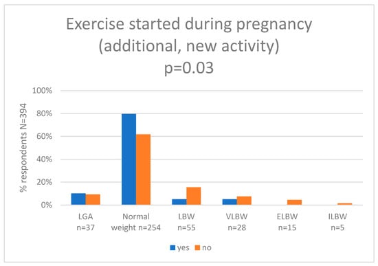 In the next step, we assessed self-perceived maternal exercise during pregnancy and we compared results with the newborn birth weight category. Pearson’s chi-squared test showed statistically significant differences between the groups (p = 0.03). In the group of women who were active, 10.2% (n = 6) newborns had LGA, 79.6% (n = 47) newborns had a normal birth weight, 5.1% (n = 3) had low birth weight (LBW), 5.1% (n = 3) had very-low birth weight (VLBW), 0.0% (n = 0) had extremely (ELBW), and 0.0% (n = 0) had incredible low birth weight (ILBW). In the group of women who were not active, 9.2% (n = 31) newborns had LGA, 61.8% (n = 207) newborns had a normal birth weight, 15.5% (n = 52) had low birth weight (LBW), 7.5% (n = 25) had very-low birth weight (VLBW), 4.5% (n = 15) had extremely (ELBW), and 1.5% (n = 5) had incredible low birth weight (ILBW). The results are shown in Figure 4 and Supplementary Table S9.