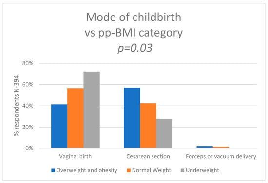 One of the most important findings of our study is that pre-pregnancy BMI affected the mode of the childbirth. Women who had normal pre-pregnancy BMI or were underweight had a lower risk of having a cesarean section (CS) compared to women with overweight or obesity. The last two decades have seen an increase in CS worldwide. In the middle and highly developed countries, almost half of the women gave birth by CS. Poland has one of the highest percentages of cesarean sections (42%) in Europe, where the average is 27% []. We are still looking for strategies to reduce CS and we should also consider education on the benefits of maintaining a healthy BMI as part of pre-conceptual care. Many authors obtained results that associated increasing BMI with increasing rates of adverse obstetric outcomes, including higher rates of CS [,,].