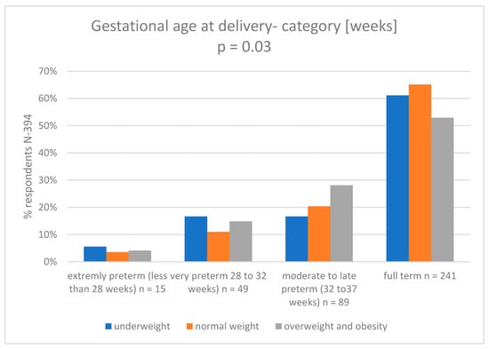 Importantly, the literature data indicate that prematurity is not directly related to high BMI (>30, obesity), but results from medical complications that usually accompany high BMI []. Our analysis shows that the mothers of children who had full term births were more likely to have normal weight or be underweight, while mothers who had preterm births were more likely to be underweight, overweight, or have obesity. In detailed analyses, we noted that that the problem of being underweight in the mother affected children born before 32 weeks of age to a greater extent, while overweight and obesity in the mother affected children born between 32–37 weeks of pregnancy to a greater extent.