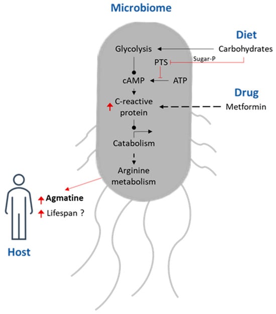 In addition, agmatine is a member of biogenic amines and is an important medicine that is widely used to regulate body balance and neuroprotective effects [76]. A four-way host–microbe–drug–nutrient screening has been performed with a high-throughput method investigating host–microbe–drug–nutrient interactions with metformin, a very common drug used in type-2 diabetes. It was found that metformin host effects are linked and regulated by the bacterial nutrient agmatine signalling pathway (Figure 1) [77].