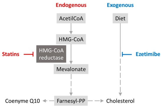 As previously mentioned, coenzyme Q10 can be obtained endogenously through the mevalonate pathway. This pathway starts with Acetyl-CoA as the initial substrate, leading to HMG-CoA, then mevalonate, and other intermediates, ultimately producing cholesterol, dolichol, and coenzyme Q10 as end products [86]. Statins inhibit HMG-CoA reductase, the enzyme that catalyses the conversion of HMG-CoA to mevalonate, thereby reducing cholesterol production. However, by inhibiting this enzyme, they also decrease the production of coenzyme Q10. This mechanism explains the coenzyme Q10 depletion caused by statins, but the benefits outweigh the risks (Figure 2) [87].