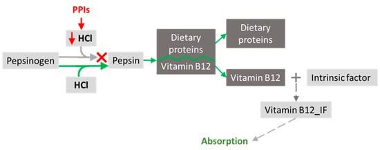 Since PPIs are acid suppressors, there may be a reduction in the conversion of pepsinogen to pepsin, and, consequently, there will not be the separation of vitamin B12, which could lead to decreased absorption. Moreover, the elderly population is prone to IF deficiency [105]. These factors contribute to vitamin B12 deficiency in older adults taking PPIs. Indeed, there is a significantly increased risk of vitamin B12 deficiency in chronic PPI users (for more than continuous 12 months) compared to non-users or short-term users (Figure 3).