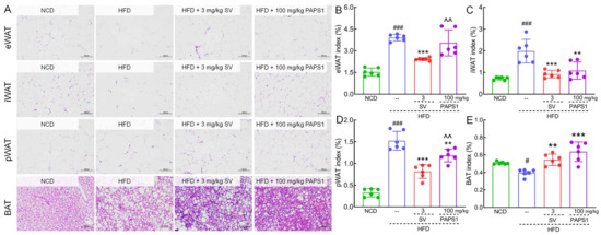 PAPS1 inhibited fat accumulation in HFD-induced HLP mice. (A) Histopathological analysis of eWAT, iWAT, pWAT, and BAT was performed using H&E staining (200×; scale bar: 100 μm) (n = 3). PAPS1 treatment had no significant effect on eWAT index (B) but reduced the indexes of iWAT (C) and pWAT (D) and enhanced the BAT index (E) in HFD-induced HLP mice. Data are expressed as the mean ± S.E.M. (n = 6). # p < 0.05 and ### p < 0.001 vs. NCD group; ** p < 0.01 and *** p < 0.001 vs. HFD group; ^^ p < 0.01 vs. SV group. NCD: normal chow diet; HFD: high-fat diet; SV: simvastatin; PAPS1: Pleurotus abieticola polysaccharide; eWAT: epididymal white adipose tissue; iWAT: inguinal white adipose tissue; pWAT: perirenal white adipose tissue; BAT: brown adipose tissue.