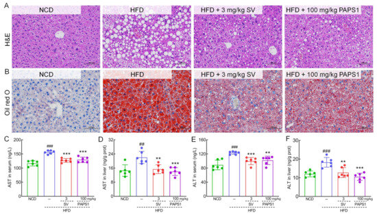 PAPS1 improved liver injury in HFD-induced HLP mice. Histopathological analysis of liver was performed using H&E staining (A) and oil red O staining (B) (200×; scale bar: 100 μm) (n = 3). PAPS1 treatment reduced the levels of AST (C,D) and ALT (E,F) in serum and liver of HLP mice caused by HFD intake. Data are expressed as the mean ± S.E.M. (n = 6). ## p < 0.01 and ### p < 0.001 vs. NCD group; ** p < 0.01 and *** p < 0.001 vs. HFD group. NCD: normal chow diet; HFD: high-fat diet; SV: simvastatin; PAPS1: Pleurotus abieticola polysaccharide; H&E: hematoxylin and eosin; ALT: alanine aminotransferase; AST: aspartate transaminase.