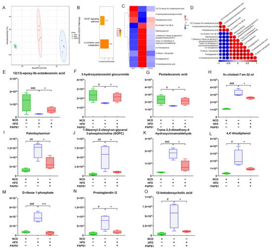 PAPS1 regulated the fecal metabolite level in HFD-induced HLP mice. (A) OPLS-DA score plot of fecal metabolites among NCD, HFD, and PAPS1 groups. (B) KEGG-enriched metabolic pathways of significantly altered fecal metabolites between HFD and PAPS1 groups. Heatmap (C), the associated heatmap (D), and boxplots (E–O) of significantly differential metabolites in intestinal feces among three groups. Data are expressed as the mean ± S.E.M. (n = 4). # p < 0.05, ## p < 0.01, and ### p < 0.001 vs. NCD group; * p < 0.05 and *** p < 0.001 vs. HFD group. KEGG: Kyoto Encyclopedia of Genes and Genomes; VEGF: vascular endothelial growth factor; NCD: normal chow diet; HFD: high-fat diet; PAPS1: Pleurotus abieticola polysaccharide.