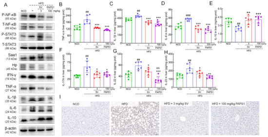 PAPS1 treatment inhibited NF-κB/STAT3-mediated inflammatory response in HFD-induced HLP mice. (A) PAPS1 treatment suppressed NF-κB/STAT3 signaling pathway and its related downstream proteins of liver in HFD-induced HLP mice. PAPS1 treatment down-regulated the hepatic levels of TNF-α (B), IL-1β (C), IL-6 (D), IL-17A (F), IL-22 (G), and IL-23 (H), and up-regulated the hepatic level of IL-10 (E) in HFD-induced HLP mice. Data are expressed as the mean ± S.E.M. (n = 6). ## p < 0.01 and ### p < 0.001 vs. NCD group; * p < 0.05, ** p < 0.01, and *** p < 0.001 vs. HFD group; ^^ p < 0.01 vs. SV group. (I) PAPS1 treatment suppressed the hepatic level of P-NF-κB in HFD-induced HLP mice, as analyzed using IHC. NF-κB: nuclear factor-κB; P-NF-κB: phosphorylated NF-κB; STAT3: signal transducer and activator of transcription 3; P-STAT3: phosphorylated STAT3; Saa1: serum amyloid A protein; Hp: haptoglobin; IFN-γ: interferon-γ; TNF-α: tumor necrosis factor; IL-1β: interleukin-1β; HFD: high-fat diet; NCD: normal chow diet; PAPS1: Pleurotus abieticola polysaccharide; SV: simvastatin.