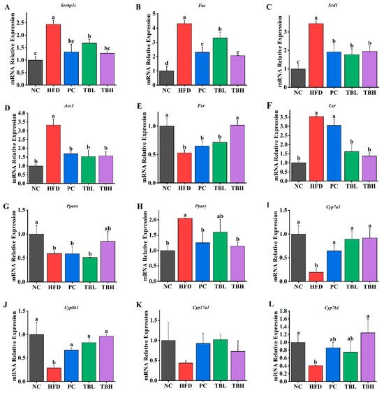 The mRNA relative expression of genes related with lipid metabolism in liver of mice in five groups. (A) Srepb1c; (B) Fas; (C) Scd1; (D) Acc1; (E) Fxr; (F) Lxr; (G) Pparα; (H) Pparγ; (I) Cyp7a1; (J) Cyp8b1; (K) Cyp27a; (L) Cyp7b1. a–d Means sharing no common superscripts differ significantly (Tukey test, p < 0.05).