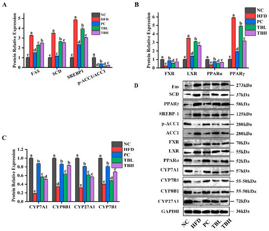 The expression levels of proteins associated with liver lipid metabolism pathways in each group of mice. (A) Downstream proteins of SREBP; (B) upstream proteins of SREBP; (C) proteins related to bile acid metabolism; (D) protein electrophoresis image. a–e Distinct letters denote a significant variance in mean values (Tukey test, p < 0.05).