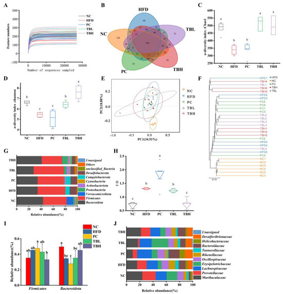 The effects of theabrownin on gut microbiota in mice fed a high-fat diet. (A) Sequencing depth; (B) Venn diagram; (C) Chao1 index; (D) Shannon index; (E) PCA analysis; (F) UPGMA clustering analysis; (G) relative abundance of bacterial groups at the phylum level; (H) ratio of Firmicutes to Bacteroidetes; (I) relative abundance of Firmicutes and Bacteroidetes; and (J) relative abundance of bacterial groups at the family level. a–c Distinct letters denote a significant variance in mean values (Tukey test, p < 0.05).