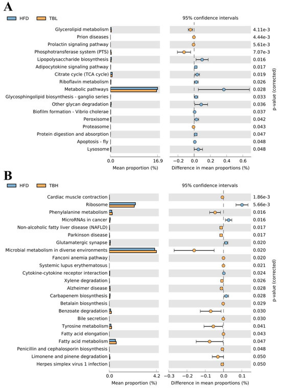 The differences in functional genes of microbial communities in metabolic pathways among different groups by analyzing the composition and differences of KEGG metabolic pathways. (A) Analysis of KEGG metabolic pathway differences between the TBL and HFD group. (B) Analysis of KEGG metabolic pathway differences between the TBH and HFD group.