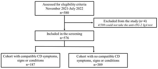A cross-sectional observational study of CD screening was conducted at 12 different centers in Seville and Madrid (Spain) from November 2021 to March 2023. The study was conducted according to the guidelines of the Declaration of Helsinki and approved by the Ethics Committee of Hospital Universitario Virgen Macarena (Seville, Spain) (n. 2021/273) (ClinicalTrials.gov identifier NCT05186038). Informed consent was obtained from all parents or legal guardians of subjects involved in the study, as they were under 14 years old.