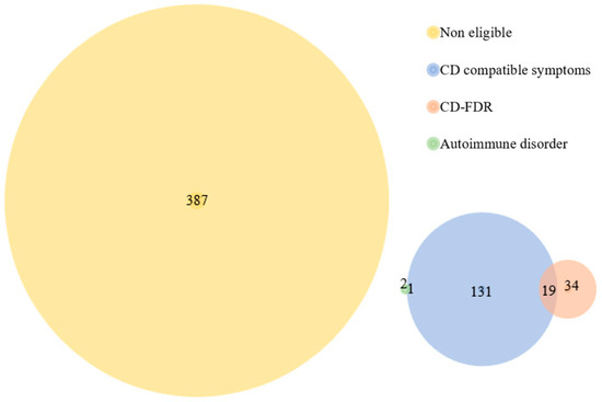 In agreement with the ESPGHAN 2020 guidelines, 187/576 (32.46%) volunteers would have been candidates for testing for CD diagnosis because of the symptoms, signs and conditions declared on the clinical evaluation questionnaire (Figure 1). In contrast, 389/576 (67.53%) would most probably not have had confirmatory tests, because they do not fit into the ESPGHAN 2020 diagnostic flow (Figure 1) [14]. It is stated that these 187 would have been candidates for the CD tests because, at the time of screening inclusion, 151/187 (80.75%) volunteers had been suffering from at least one CD-related symptom for more than a month without an established cause; a total of 53/187 (28.34%) patients were aware of a CD-FDR, of whom 19/53 (34.85%) had CD-related symptoms; and 3 out of the 187 (3/187;1.60%) volunteers stated that they had been previously diagnosed with other autoimmune diseases: two with autoimmune thyroid disease, of which one had CD-compatible symptomatology, and one with type 1 diabetes (Figure 2).