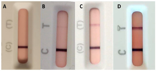 Anti-tTG-IgA lateral flow immunoassay test results according to the test line. (A) absent, (B) almost undetectable gray line, (C) faint or unsaturated red line, and (D) dark or saturated red line.