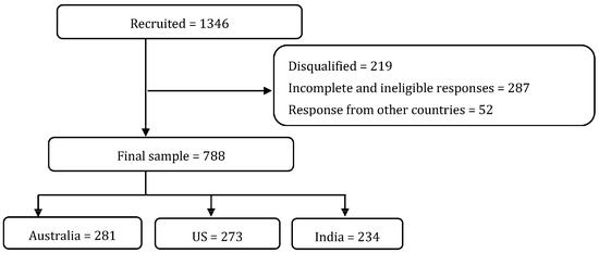Based on analogous literature in different populations, to examine the relationship between psychosocial factors/pregnancy planning and PA, a sample size of approximately 483 is required to detect a small-medium effect size (f2 = 0.04) with 80% power at alpha = 0.05. To accommodate the inclusion of participants from diverse countries, thereby enhancing the generalizability of our findings and ensuring a broader representation of populations, we recruited a larger sample. Our final sample size of 1346 women was recruited from 13 different countries, with the majority (93%) coming from the USA, India, and Australia. Observations from 10 countries, which had only a handful of responses each (n = 52), were excluded from the analysis to maintain robustness. The final analytical sample consisted of 788 participants, which exceeded our initially calculated sample size. The flow of participants in the study is presented in Figure 1.