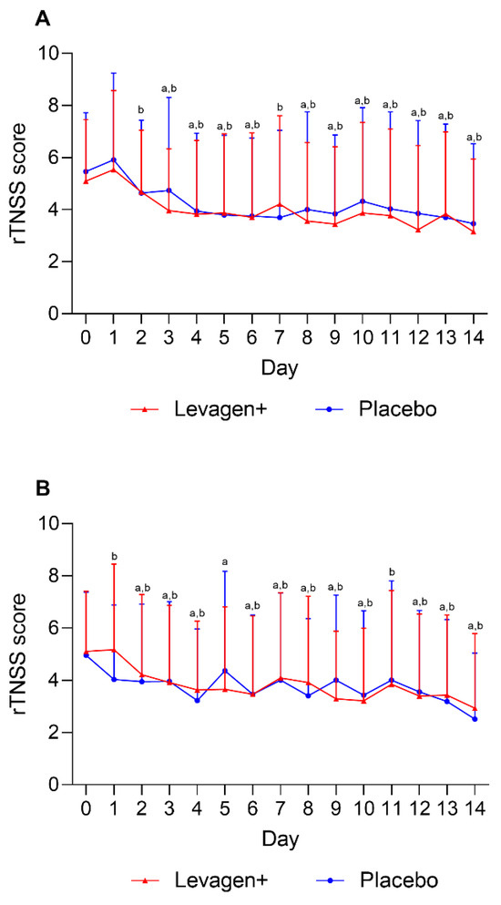 Daily reflective total nasal symptoms (rTNSS) scoring for (A) AM scores and (B) PM scores. a = significant difference (p < 0.05) to baseline scores for Levagen+ group; b = significant difference (p < 0.05) to baseline scores for placebo group.