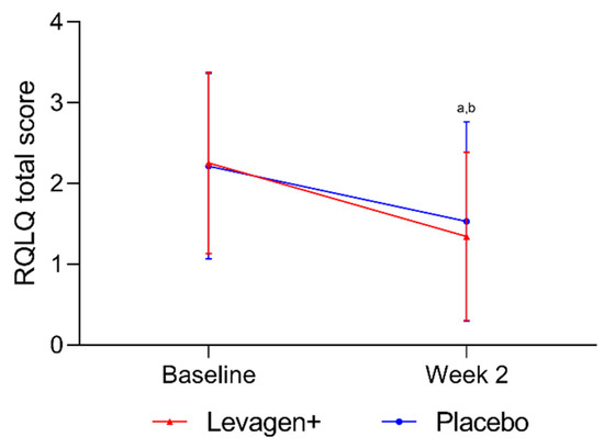 Total RQLQ scores for all participants. a = significant difference (p < 0.05) to baseline scores for Levagen+ group; b = significant difference (p < 0.05) to baseline scores for placebo group.