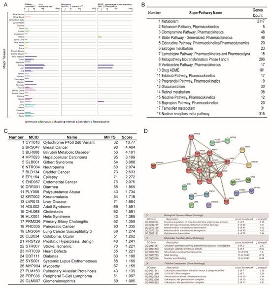 Tissue specificity and functional analysis of UGT2B7 gene expression. (A) UGT2B7 mRNA expression in normal human tissues from GTEx, Illumina, BioGPS, and SAGE, data from GeneCards. (B) Pathway unification of UGT2B7 gene by PathCards analysis. (C) Analysis of its association with human diseases by MalaCards analysis (Score above 1.000). (D) Gene association and gene ontology analysis by STRING database.