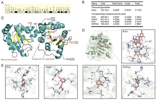 The molecular docking of plant chemical ligands with UGT2B7 protein motifs (PDB ID: 2O6L) was used to explore the interaction and combination patterns between dietary flavone glycosides, aglycones, or their metabolites with UGT2B7. UGT2B7 is a nuclear gene located on human chromosome 4 (Figure 2A). Initially, we explored the preference for the combination pattern between UGT2B7 and rutin, a typical O-glycosylflavone, or its metabolites, including 3,4-dihydroxytoluene (DHT), 4-hydroxy-3-methoxyphenylacetic acid (HVA), 3,4-dihydroxyphenylacetic acid (DHPAA), and 3-hydroxyphenylacetic acid (HPAA) [,] (Figure 2B). According to the sequence alignment of GT1 family enzymes and the C-terminal domain sequences from human UGT2B7 [], the amino acid residues of the binding capsule of UGT2B7 that bind to these biomolecules were summarized, including GLU291, MSE292, LEU353, LYS355, TRP356, ALA377, ASP401, ASN402, and HIS405 (Figure 2C). We found that rutin has a stronger binding capacity than its phenolic acid metabolites, which sparked our interest in whether there are differences between flavone glycosides, aglycones, and their metabolites in the regulation of UGT enzymatic activity, and their biological function may be one factor. The specific binding locations and the donor binding region are shown in Figure 2D,E. The hydrophobic contacts and involved amino acid residues are listed in Figure S1.