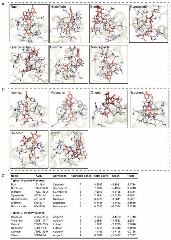 Compared to other types, flavonoid glycosides are the main form of human intake from plants. According to the types of glycosidic bonds, flavones can be divided into flavone O-glycosides and flavone C-glycosides. Although there have been studies comparing the differences in the performance of flavone O-glycides and flavone C-glycides in pyrolysis and enzymolysis [], as well as the function in alleviating lipid accumulation [,], the mechanism by which this functional difference arises is still unclear.
