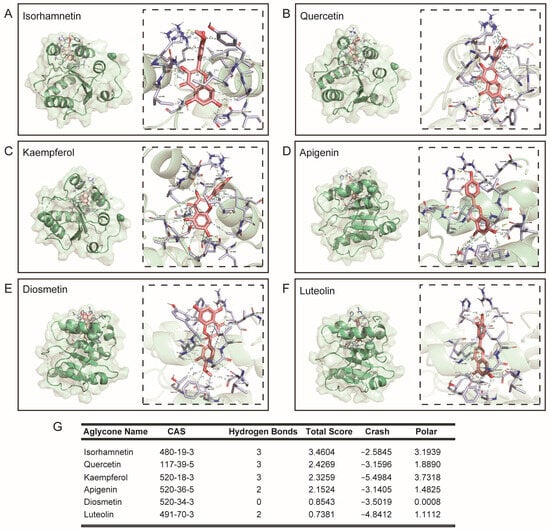Molecular docking of typical flavonols towards UGT2B7 (2O6L). Stereo views of Ligplot algorithm model of (A) isorhamnetin, (B) quercetin, (C) kaempferol, (D) apigenin, (E) diosmetin and (F) luteolin-UGT2B7 protein interactions. (G) The preference of combination pattern between the six typical flavonols and activity cavity of typical UGT2B7.
