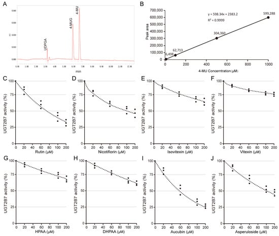 Dose-dependent inhibition behavior of typical flavone glycosides and other components toward recombinant human UGT2B7. (A) A direct HPLC assay for the determination of UDPGA, 4-MU, and 4-MUG. (B) The standard curve of 0–1 mM 4-MU. Inhibition screening of UGT2B7 by (C) rutin, (D) nicotifiorin, (E) isovitexin, (F) vitexin, (G) HPAA, (H) DHPAA, (I) aucubin, and (J) asperuloside, respectively. Data are shown using mean values plus S.D. (n = 3).