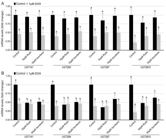 Effect of rutin and isovitexin on the transcription level of the UGT families. QRT-PCR analysis of the relative expression of UGT1A1, UGT2B4, UGT2B7, and UGT2B15 genes compared with GAPDH in HKC cells for 24 h under control and DOX conditions. (A) Exposure to the 10 μM rutin or isovitexin, (B) Exposure to the 50 μM rutin or isovitexin. Data acquisition used more than 1 × 107 cells. All the data were expressed as a percentage of the control, presented as the means ± SD of three independent experiments. The data were analyzed using one-way ANOVA. Different characters indicate significant differences between the compared groups (p < 0.05).