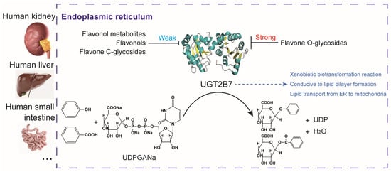 Schematic diagram of the regulation of UGT2B7 by typical flavonol derivatives. UGT2B7 is an important enzyme that catalyzes the glucuronidation of phenols, benzoic acids, and other substances. It regulates xenobiotic biotransformation reaction and intracellular transport of lipid molecules and widely spreads in the endoplasmic reticulum of human kidney, liver, small intestine, and other tissues. Glucuronidation also enhances the conductivity of lipid bilayer formation. Typical flavone O-glycosides generally inhibit the catalytic efficiency of UGT2B7, while typical flavonol metabolites, flavonols, and flavone C-glycosides show weak inhibition effects on UGT2B7, suggesting the differences in the regulation of UGT2B7 activity by forms of flavonoid derivatives. Organ images are copyrighted from https://www.turbosquid.com (Accessed on 8 August 2022).