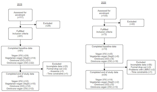 UK-wide recruitment was conducted in November–December 2019 and 2020. Flyers and email advertisements were used for those living in Nottinghamshire in 2019. In both years, social and traditional media were used to publicize the study nationally. In 2020, due to the Severe Acute Respiratory Syndrome Coronavirus 2 (SARS-CoV-2/COVID-19) pandemic, all recruitment was conducted online. Criteria for inclusion were adults aged 18–60 years (y) living in the UK. Those recruited either were changing their current diet to follow a vegan diet for 4 weeks as part of the ‘Veganuary’ pledge or were continuing their current diet (e.g., vegetarian, omnivore, etc.). Individuals who were already following a vegan diet were recruited to act as a control.