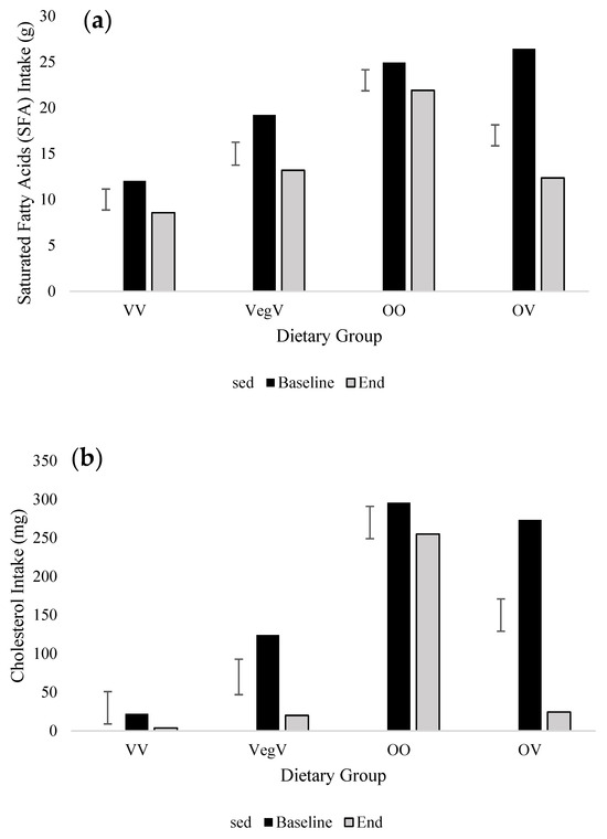 Average daily macronutrient intake non-inclusive of supplements of individuals in the 2019 cohort at baseline and end of study (End) provided Food Frequency Questionnaire (FFQ) estimates. (a) Saturated fatty acid intake (SFA), (b) cholesterol intake. Mean and standard error of the difference (within-subject) presented (SED). Only significant effects are presented and assessed by ANOVA (p ≤ 0.05). Groups are VV, vegan (n12); VegV, vegetarian-vegan (n10); OO, omnivore-omnivore (n12); and OV, omnivore-vegan (n12).