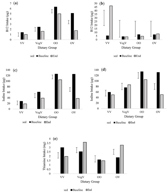 Average daily micronutrient intake non-inclusive and inclusive of supplements of individuals in the 2019 cohort at baseline and end of study (End) provided Food Frequency Questionnaire (FFQ) estimates. (a) Vitamin B12 intake non-inclusive of supplements, (b) vitamin B12 intake inclusive of supplements, (c) iodine intake non-inclusive of supplements, (d) iodine intake inclusive of supplements, (e) thiamine intake non-inclusive of supplements. No significant effects were found for thiamine intake inclusive of supplements. Mean and standard error of the difference (within-subject) presented (SED). Only significant effects are presented and assessed by ANOVA (p ≤ 0.05). Groups are VV, vegan (n12); VegV, vegetarian-vegan (n10); OO, omnivore-omnivore (n12); and OV, omnivore-vegan (n12).