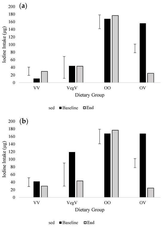 Average daily iodine intake non-inclusive and inclusive of supplements of individuals in the 2020 cohort at baseline and end of study (End) provided iodine-specific Food Frequency Questionnaire (FFQ) estimates. (a) Iodine intake non-inclusive of supplements, (b) iodine intake inclusive of supplements. Mean and standard error of the difference (within-subject) presented (SED). Significant effects are presented and assessed by ANOVA (p ≤ 0.05). Groups are VV, vegan (n14); VegV, vegetarian-vegan (n2); OO, omnivore-omnivore (n5); and OV, omnivore-vegan (n13).