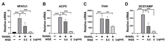NFATc1 is expressed during intermediate or late stages of osteoclast differentiation and regulates the transcription of osteoclast-specific genes []. To confirm the inhibitory effect of WSE on osteoclast differentiation induced by RANKL, we further analyzed the expression of osteoclast-specific genes through qPCR. RANKL significantly increased the mRNA levels of NFATc1, ACP5, Ctsk, and DCSTAMP, which were downregulated using WSE treatment in a dose-dependent manner (Figure 2A–D).
